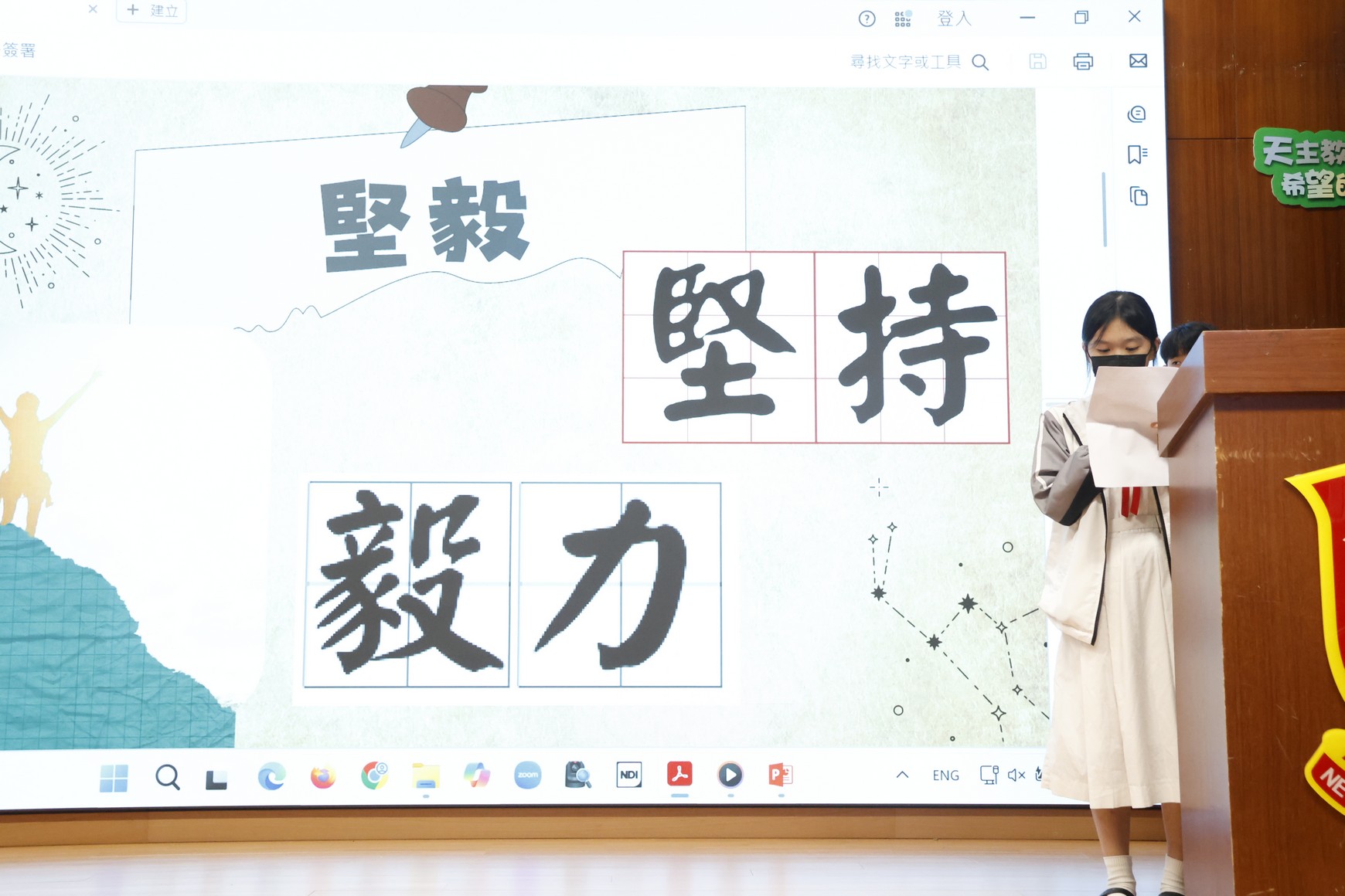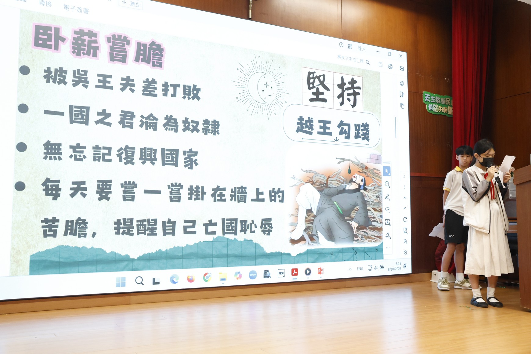 內容:本校早會舉行了中文科的主題分享活動,主題為「中國人的堅毅精神」。同學透過兩個歷史故事 - 「臥薪嘗膽」及「張騫出使西域」,向全校師生介紹中國人自古以來堅毅不屈的精神。在分享中,同學提到「臥薪嘗膽」的故事,說明越王勾踐為了報國雪恥,不怕艱苦,最終成功復國,展現出堅定的意志與毅力。而「張騫出使西域」則表現出他歷盡艱辛、歷時多年仍不放棄的精神,為國家開拓出與外國交流的道路。講者強調,這些歷史人物的故事提醒我們:堅毅是一種力量,也是成功的關鍵。無論在學業、生活還是面對困難時,只要能堅持不懈,就能克服挑戰、達成目標。