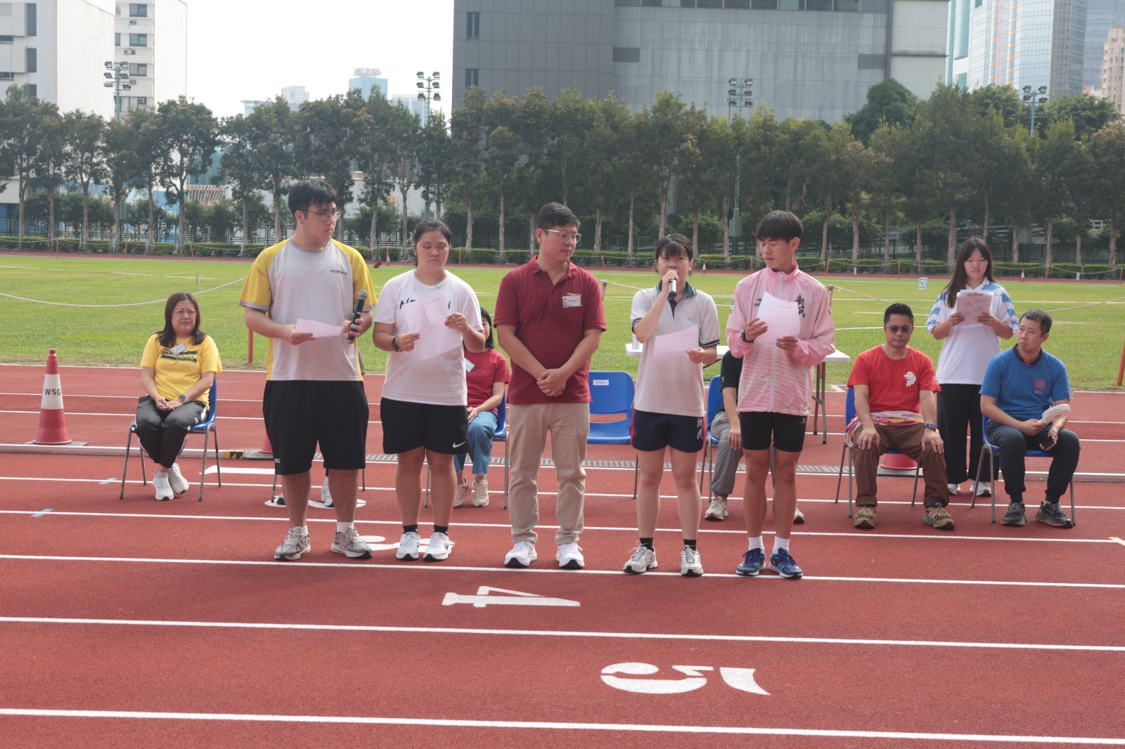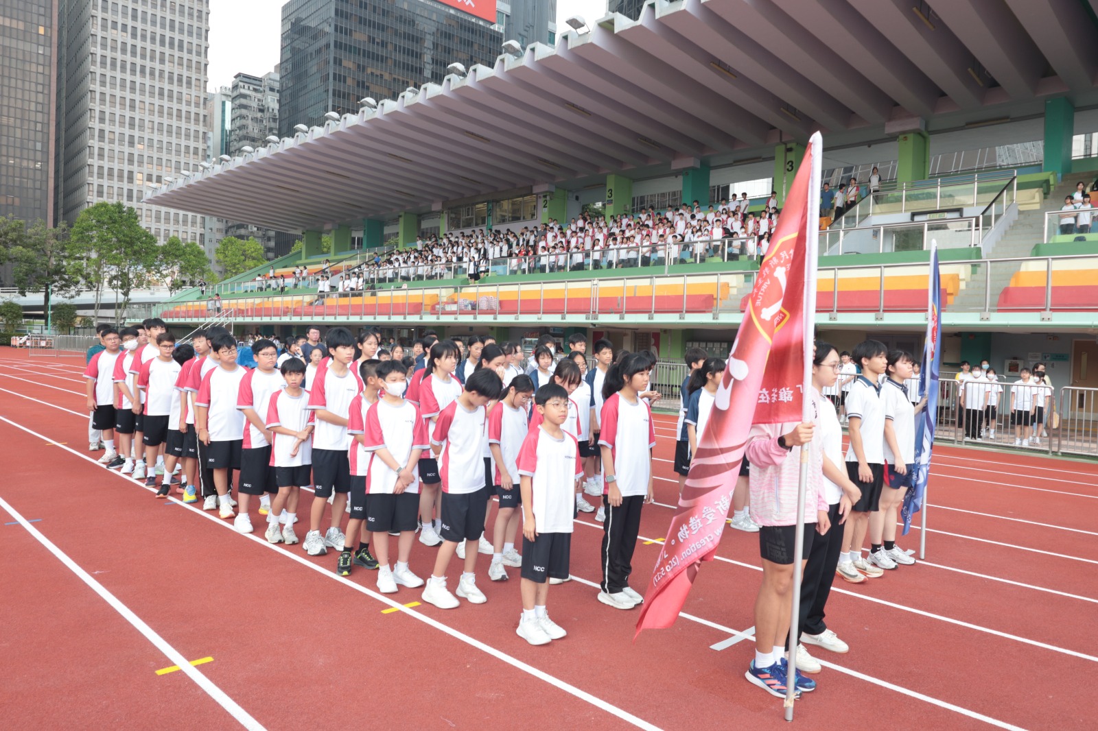 內容: 本校陸運會第一天於灣仔運動場隆重開幕。開幕儀式上,新、民、明、德四社社員精神抖擻,社長手持社旗,以整齊劃一的步伐進場,展現了昂揚的團隊風貌。校長在致詞中勉勵運動員發揮體育精神,並帶領全體選手莊嚴宣誓。隨後,各項賽事正式展開,全校師生為健兒們吶喊助威。