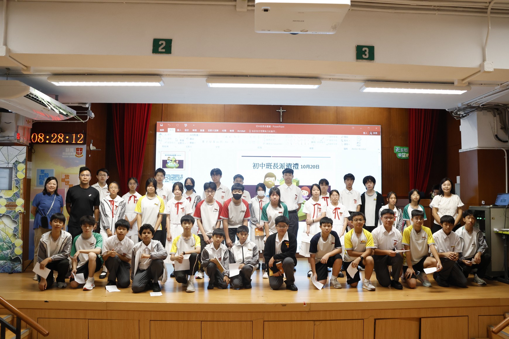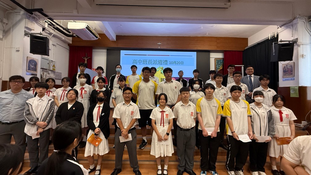 日期:2025年10月20日 內容: 在早會時間,本校於禮堂舉行了莊嚴而隆重的「班長派遣禮」,由校長和副校長主持。典禮旨在正式委任各班班長,表揚他們願意承擔責任、服務同學,並提醒全體學生紀律與合作精神的重要性。儀式開始時,全體師生肅立,由校長和副校長致辭,同時勉勵新任班長要以身作則,展現領導力與責任感,成為老師與同學之間的橋樑。隨後,各班班長依次上台接受任命,神情自信而莊重,象徵着他們正式成為班級的核心領袖。台下同學亦以熱烈掌聲為他們打氣,場面充滿活力與正能量。