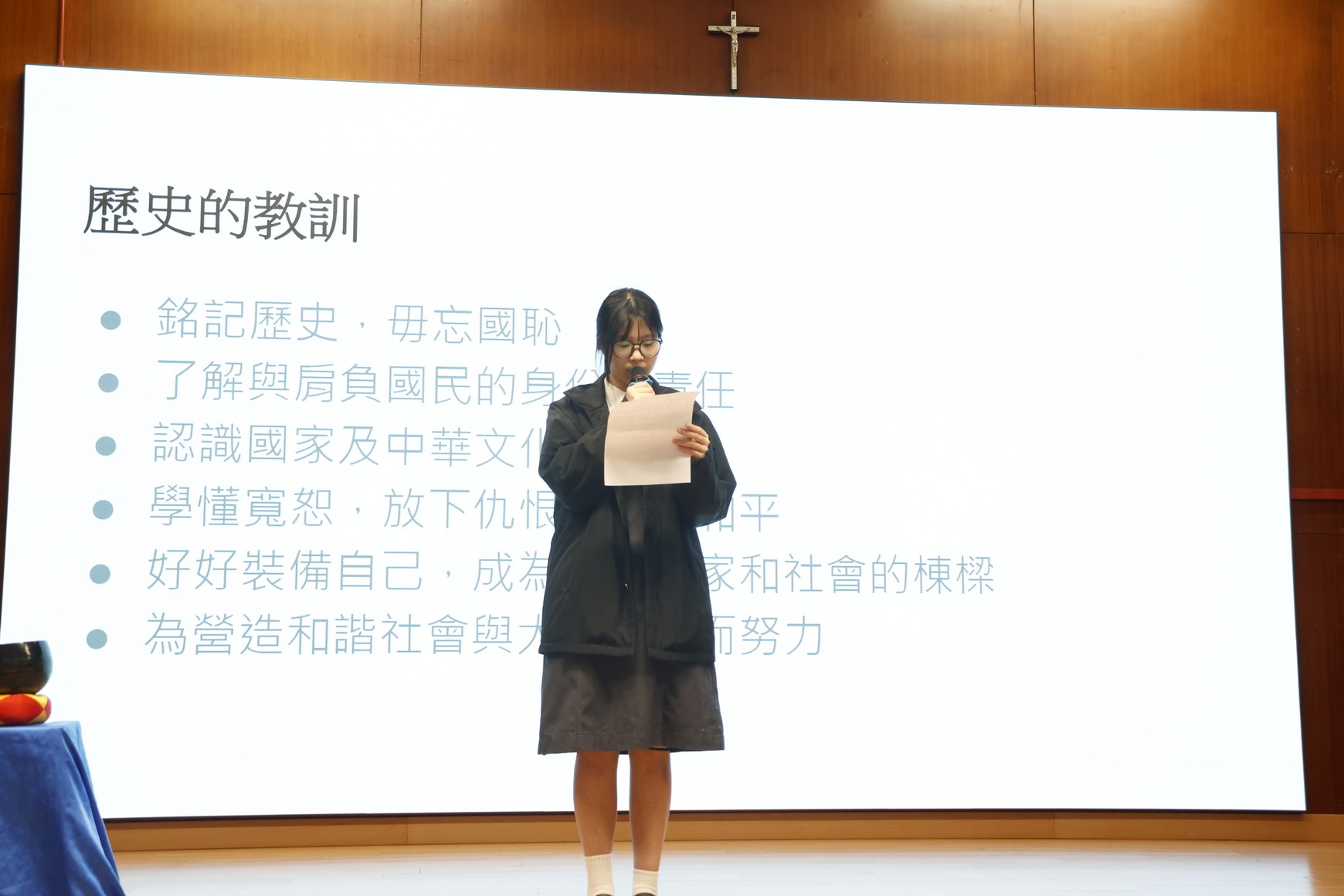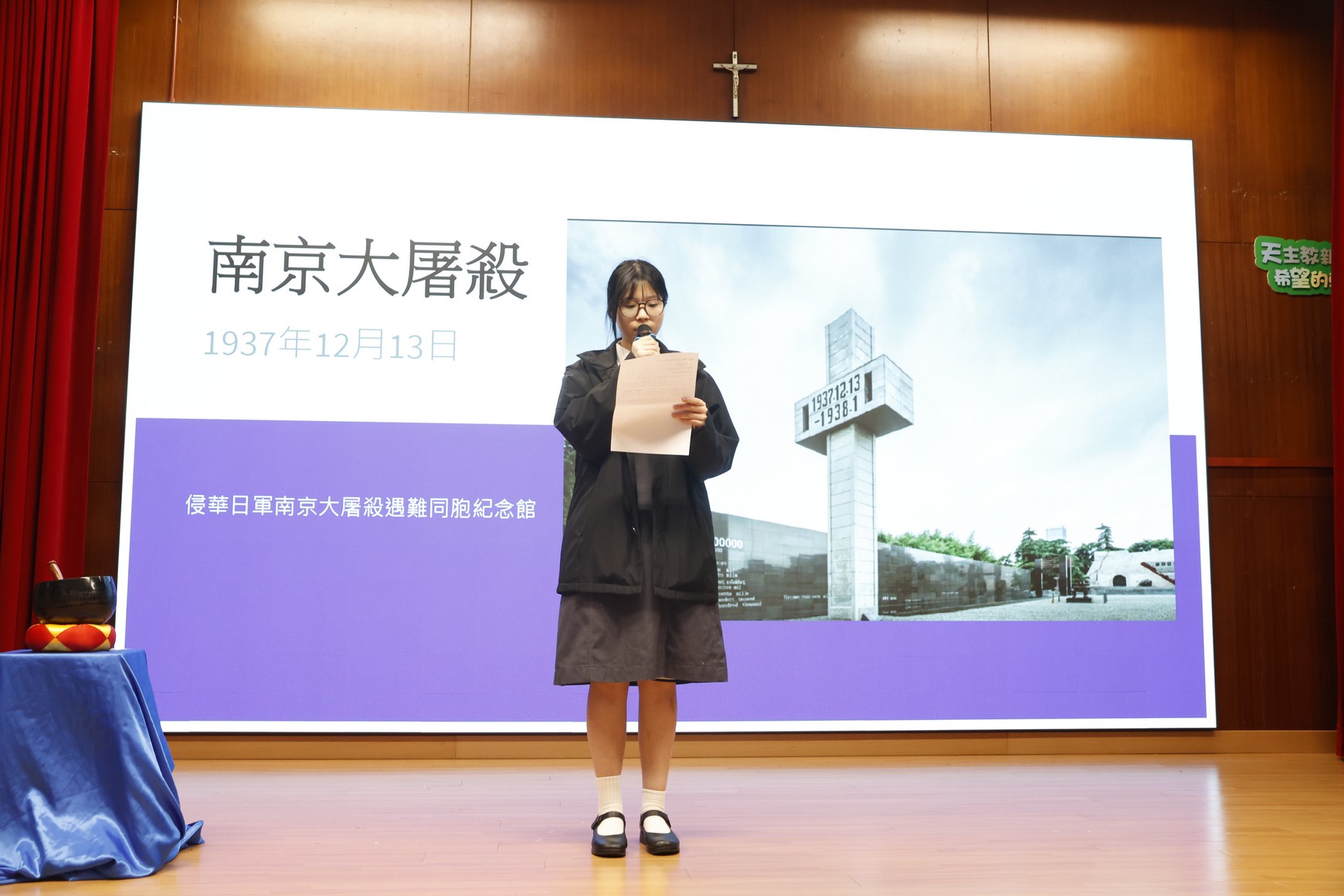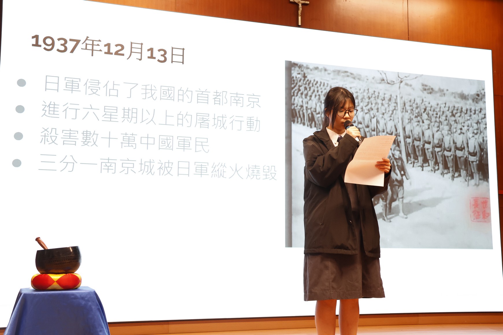 活動日期:2025年12月17日 活動內容:帶領師生回顧1937年日軍侵佔南京後造成的慘痛歷史,悼念數十萬無辜死難同胞。講話指出,12月13日不僅是國難日,更是國殤日;自2014年起,國家將此日定為「南京大屠殺死難者國家公祭日」,提醒國人以史為鑑,珍愛和平。活動同時表揚先輩先烈為保衛國家付出的犧牲,勉勵同學銘記歷史、毋忘國恥,培養國民責任感,放眼未來,珍惜和平,努力成為對社會與國家有承擔的新一代。