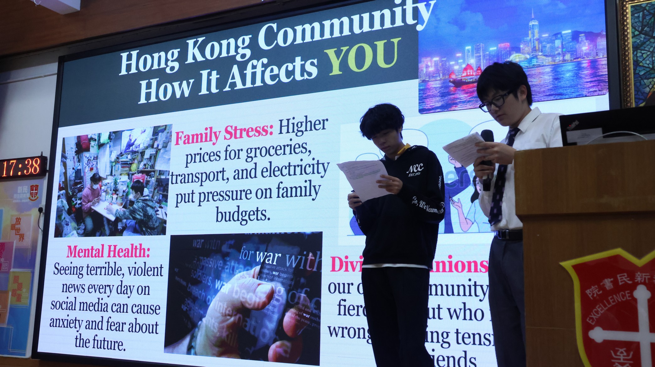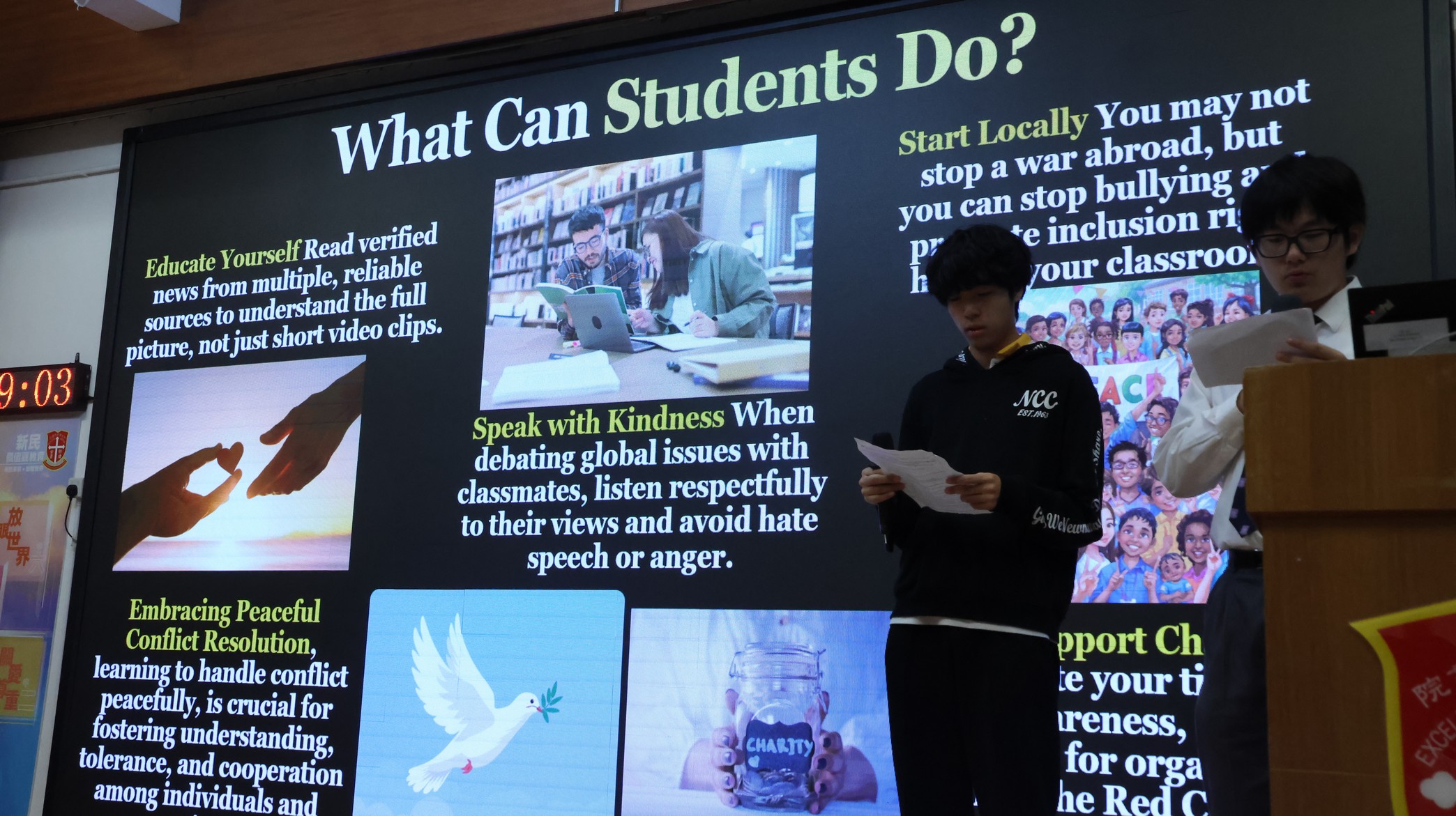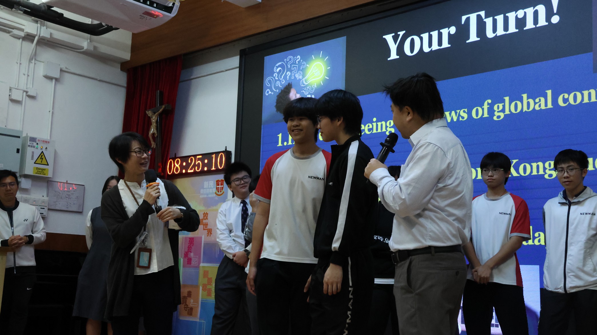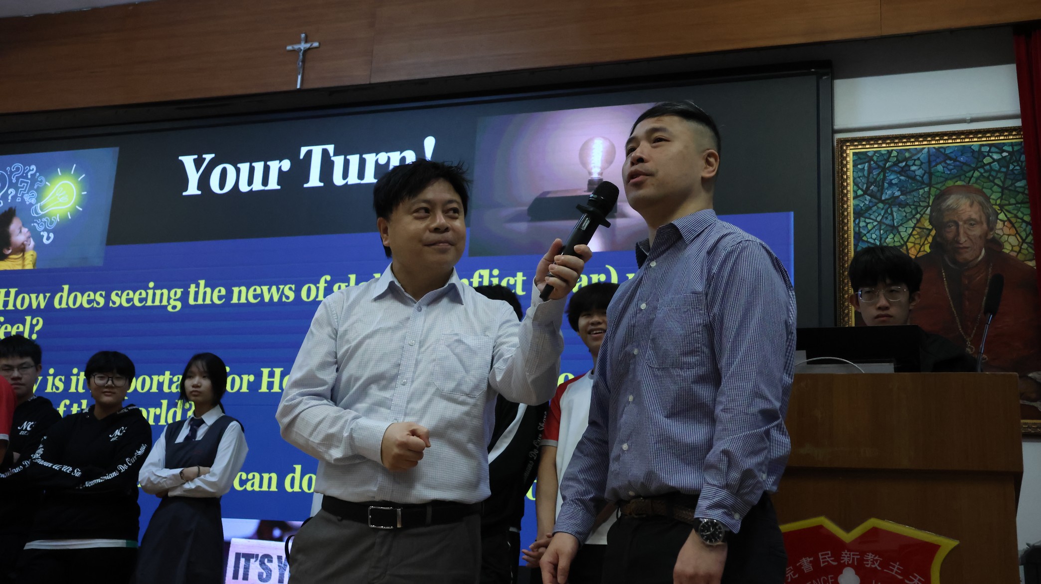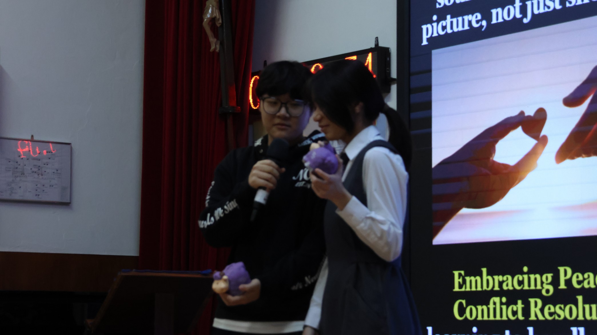 This morning, our English Friday Morning Assembly—part of Global Citizen Week—focused on “War, Conflict, and Global Peace.” Students from Class 5E2 took centre stage to share the key ideas behind why wars happen, the real human cost of conflict, and how global situations can affect communities far away, including Hong Kong. Through engaging mini-dramas and role-plays, they presented situations that helped the audience see conflict from different perspectives, encouraged empathy, and highlighted the importance of understanding rather than force. To deepen the discussion, students in the audience and Mr Kan were invited onto the stage to share their views and reflections. The assembly concluded with students reinforcing that young people can contribute to peace through critical thinking, kind communication, peaceful conflict resolution, and supporting others in need.