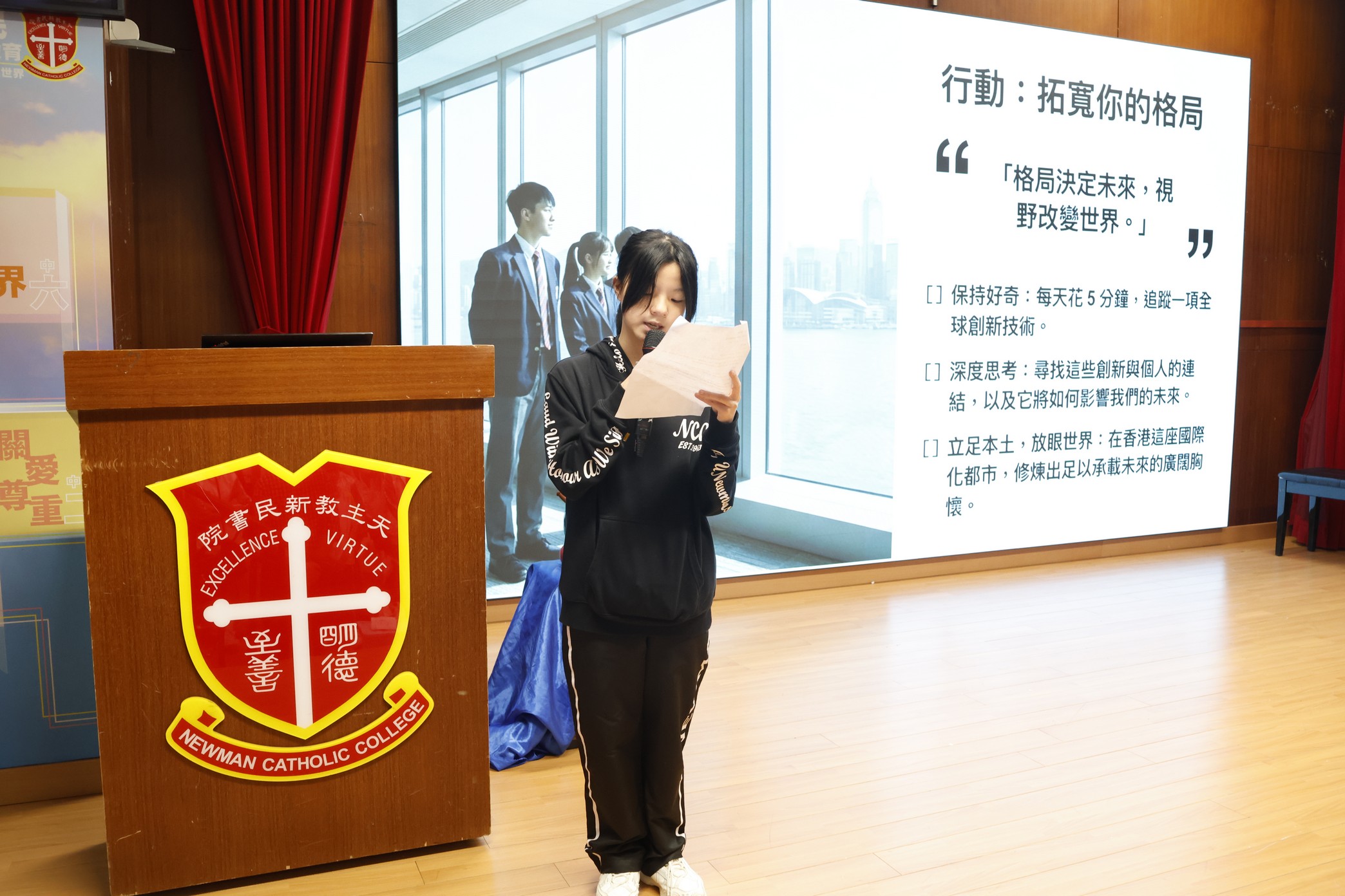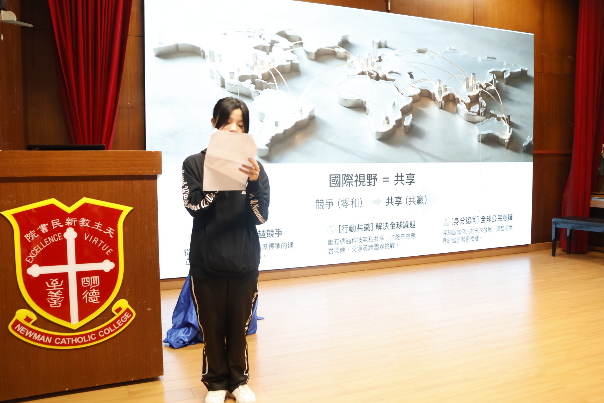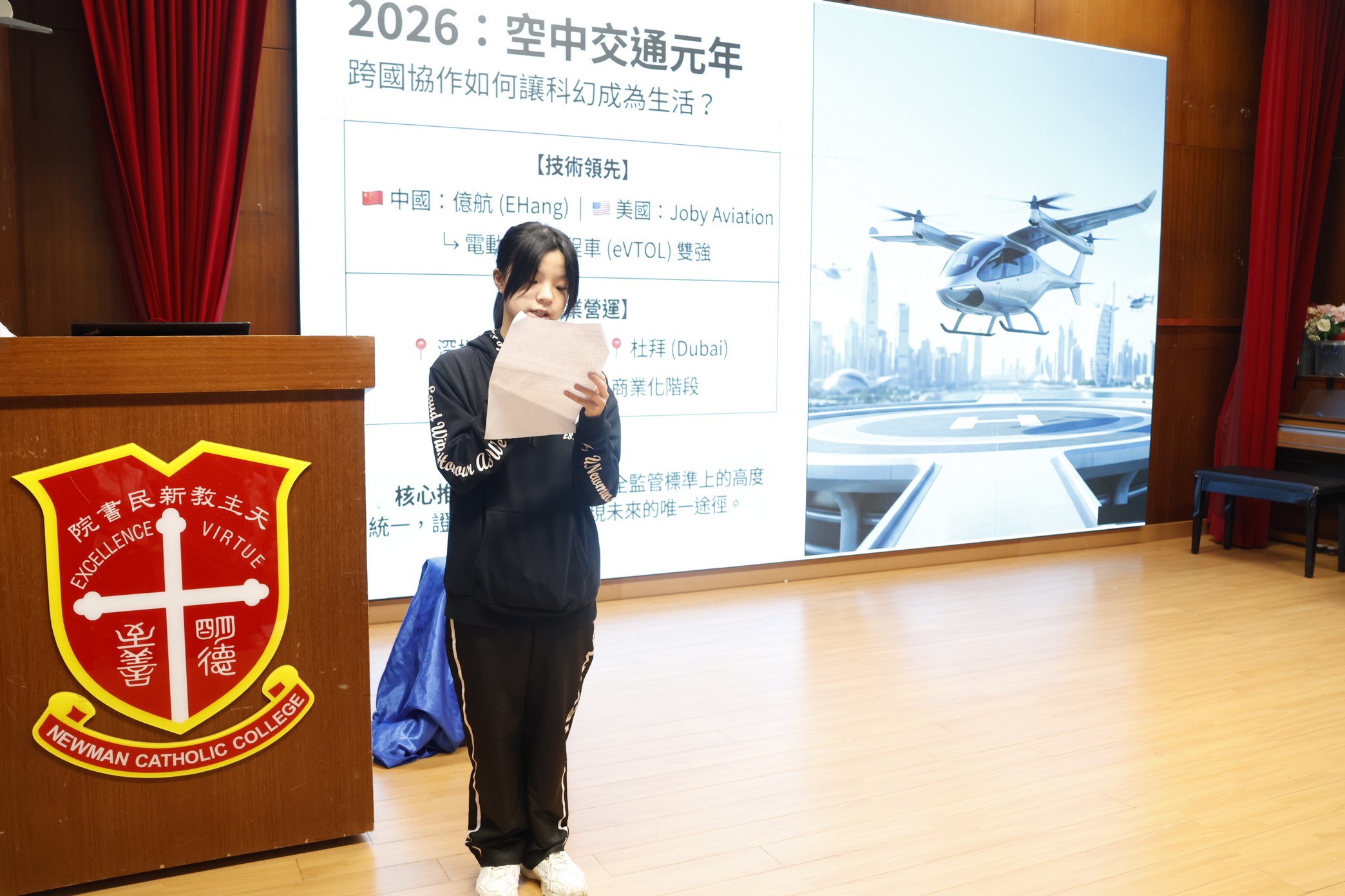 活動日期:2026年3月25日 活動內容:本校今早以「國際視野:連結全球的未來科技」為主題進行分享,強調全球協作的重要性。講者指出,隨着科技發展,各國透過合作推動創新,例如電動飛行計程車已投入應用,以及負碳混凝土技術應對氣候問題,均展現國際共同努力的成果。最後,講者勉勵同學多關心世界發展,培養國際視野,為未來作好準備。