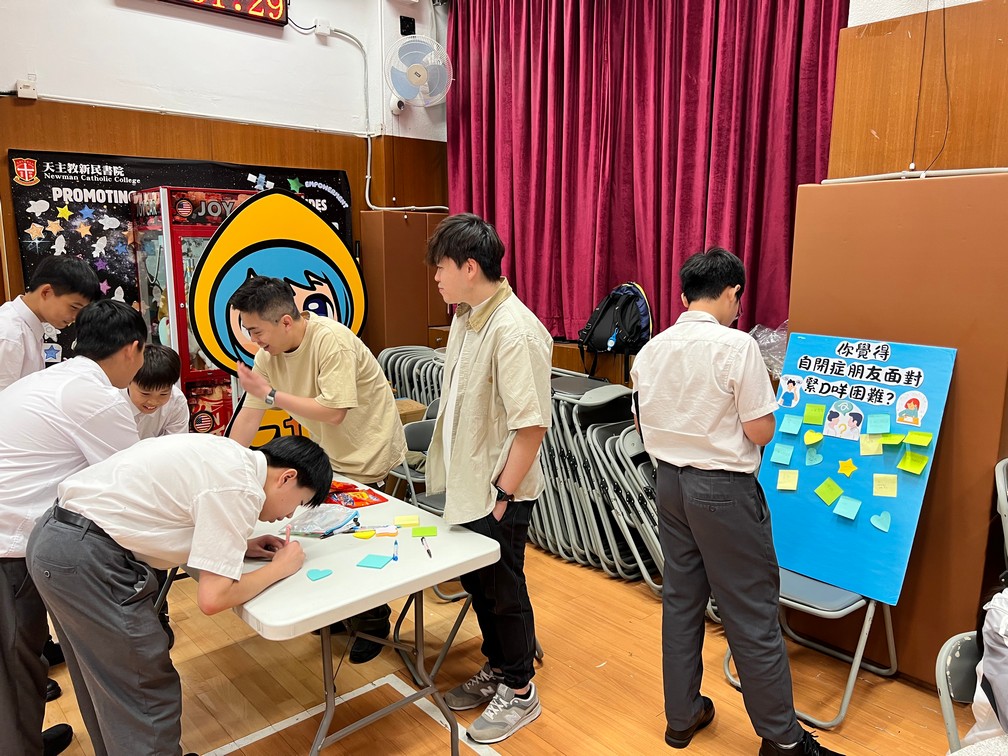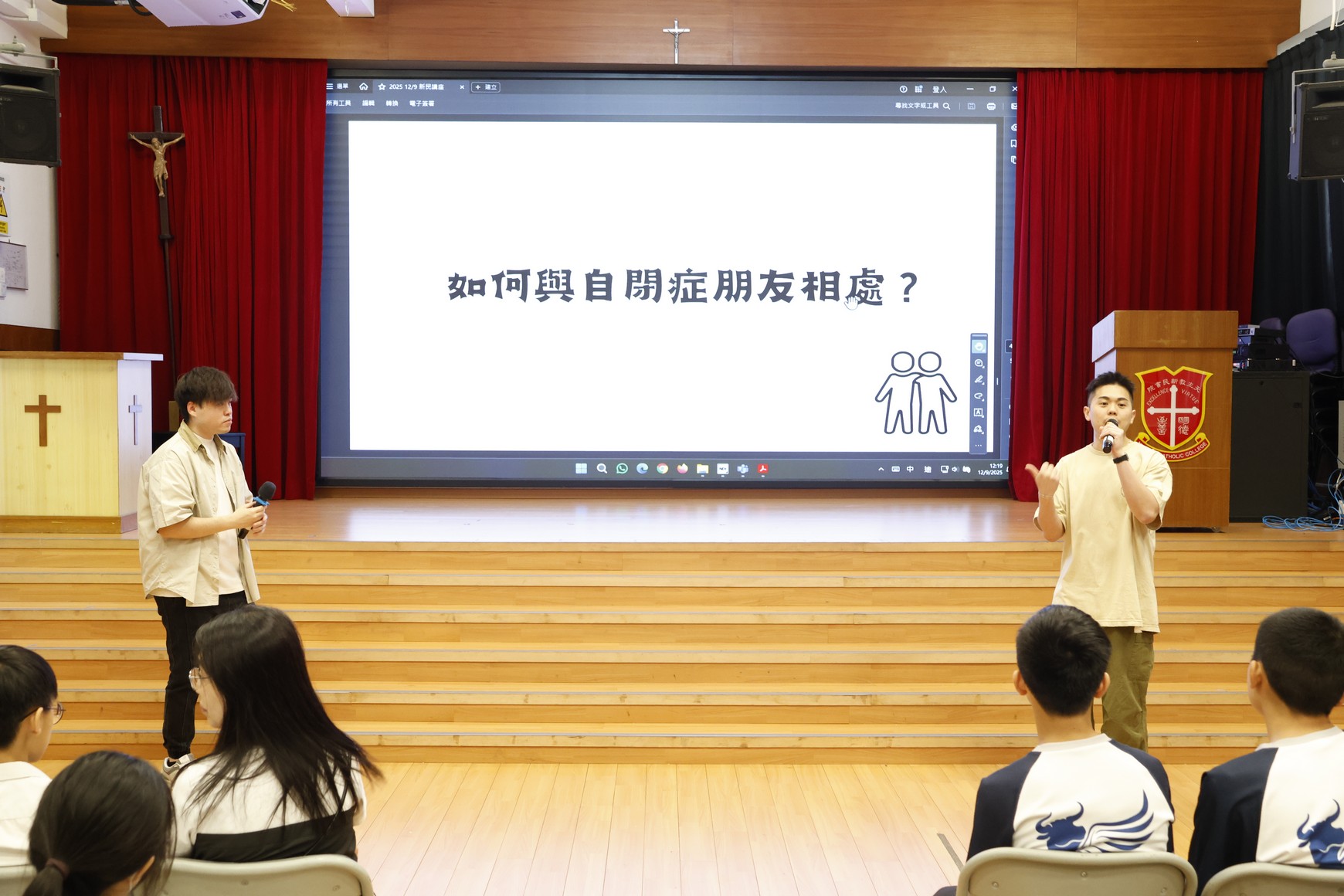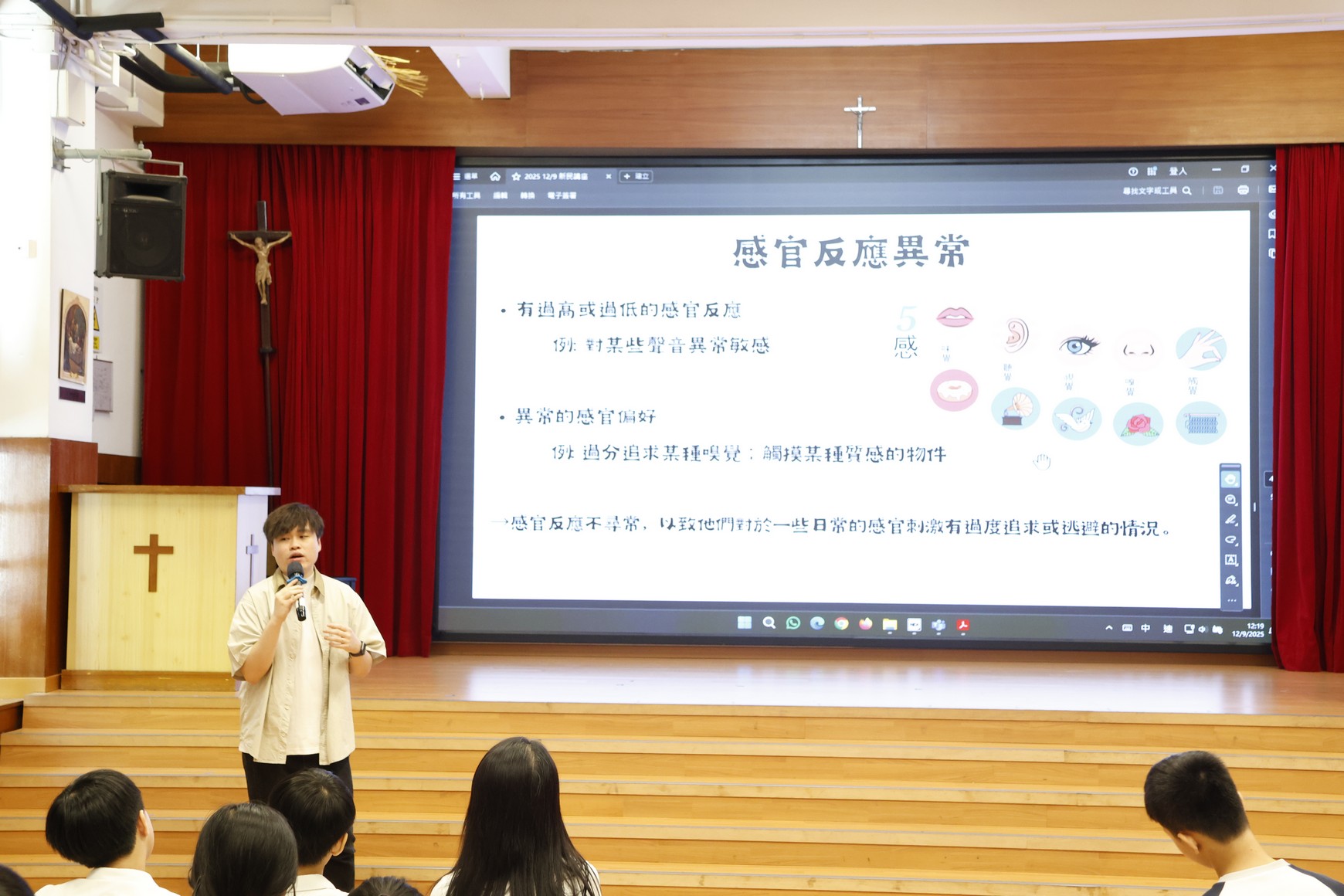 內容:透過講座讓學生認識自閉症及學習與自閉症人士相處的技巧。講座的目的不僅是讓學生初步了解什麼是自閉症,更希望藉此打開大家對特殊學習需要人士的關注與理解之門。主講嘉賓透過生動的講解、真實的個案分享及互動環節,帶領同學們從不同角度去認識自閉症人士的特質與需要。講座還特別著重於實用技巧的分享,例如:如何以耐心和清晰的表達與自閉症人士溝通、如何在日常生活中給予適度支持,以及如何以接納和尊重的態度與他們相處。這些方法不僅能幫助同學們在校園中建立更友善的氛圍,也有助於培養彼此間的理解與包容。透過今天的講座,同學們不僅增進了對自閉症的知識,更學會如何以開放和包容的心態,去與身邊不同特質的人相處。這次活動不但提升了學生的社會關懷意識,也為建立一個共融的校園環境踏出了重要的一步。