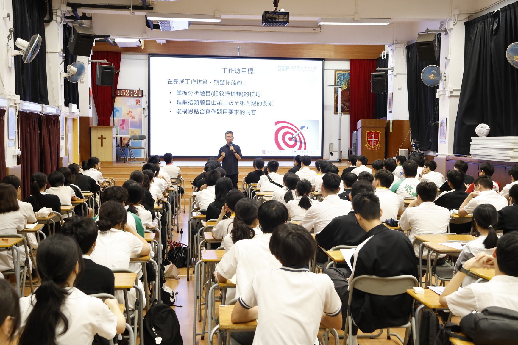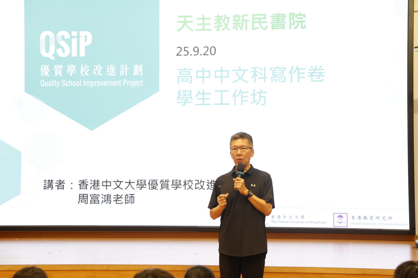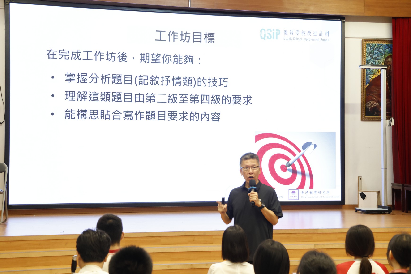 內容:為協助同學提升中文寫作能力,以應對公開考試,本校中文科與香港中文大學「優質學校改進計劃」(QSIP)合作 ,於九月二十日(星期六)學校上禮堂舉辦「學生工作坊」,工作坊邀請了中文大學周富鴻博士為中五及中六級同學講解中文科卷二的寫作要求,以及如何提升寫作能力,機會難得,同學於工作坊中表現十分認真,受益良多。